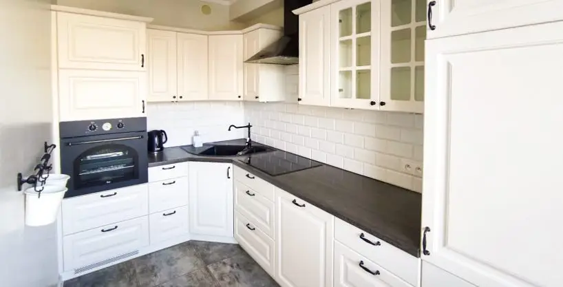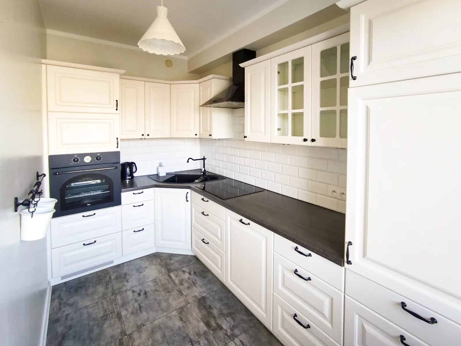Білі меблі, темна стільниця, класичні деталі — кухня виглядає естетично та позачасово. Це простір, де приготування їжі не є обов’язком, а стає частиною щоденного ритму. Тут є порядок, функціональність і місце для власних звичок.